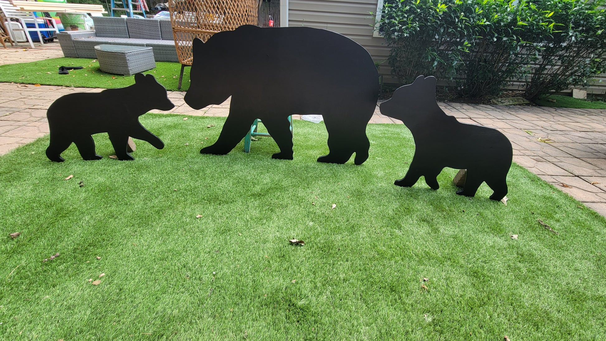 How to create a whimsical outdoor Oasis. By embracing nsture in your outdoor space. Life-size mama bear 32" tall x 46" wide. 2 Cubs are 17" tall. Handmade and handpainted by Wood Chic designs. All orders are made to order. There is a 2 week process time and will ship by FedEx home delivery