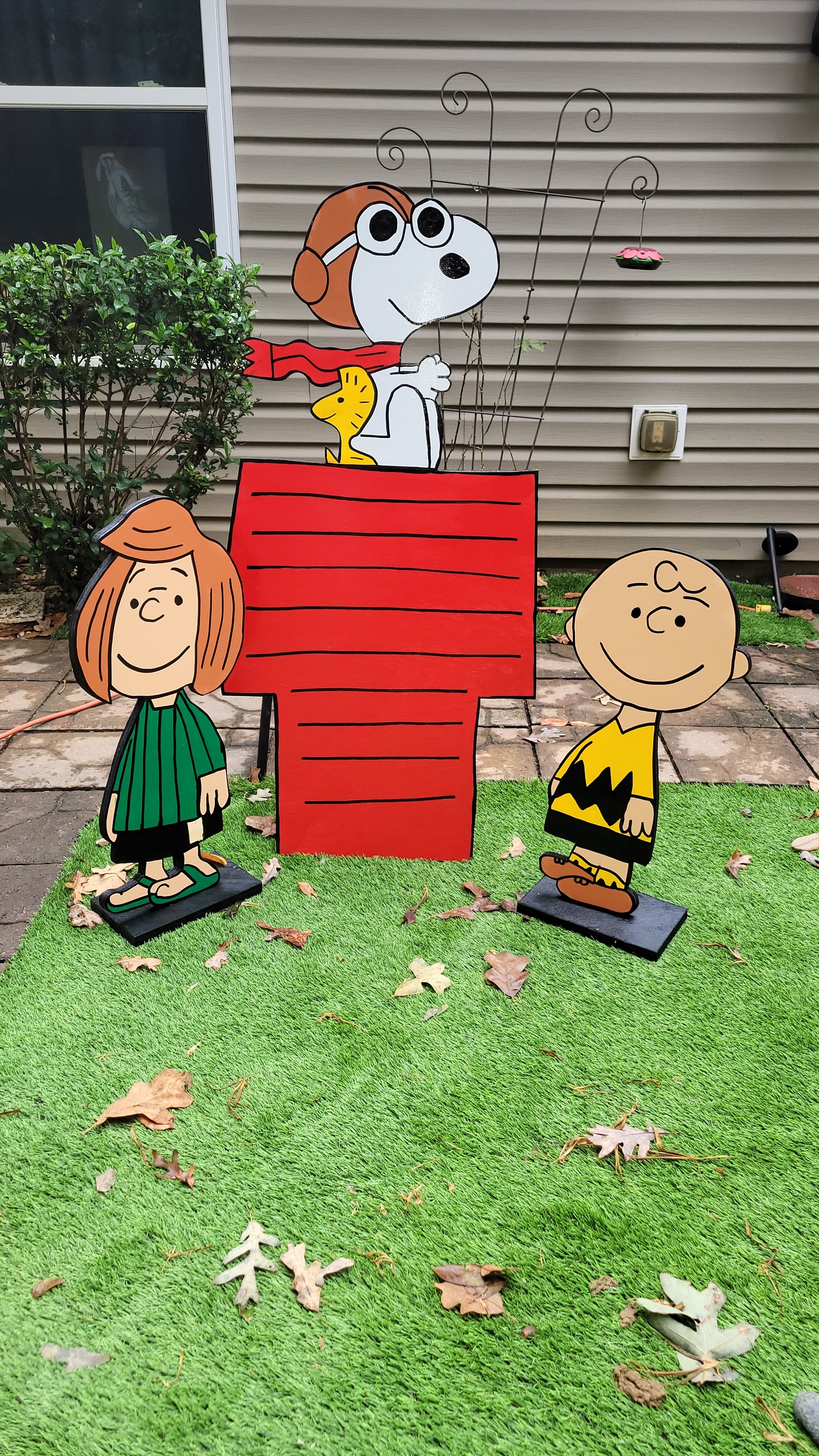 27" tall Charlie brown and Peppermint Patty. How to create a whimsical outdoor Oasis. By embracing nsture in your outdoor space. Included Snoopy on his doghouse. Handmade and handpainted by Wood Chic designs. Weather sealed with outdoor poly shield clear coat. All orders are made to order 2 week process time before shipping.