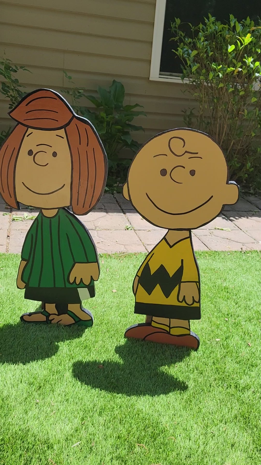 27" tall Charlie Brown and Peppermint Patty. Handmade and handpainted by Wood Chic designs. Weather sealed with outdoor poly shield clear coat. All items are made to order and 2week process time before shipping by FedEx home delivery