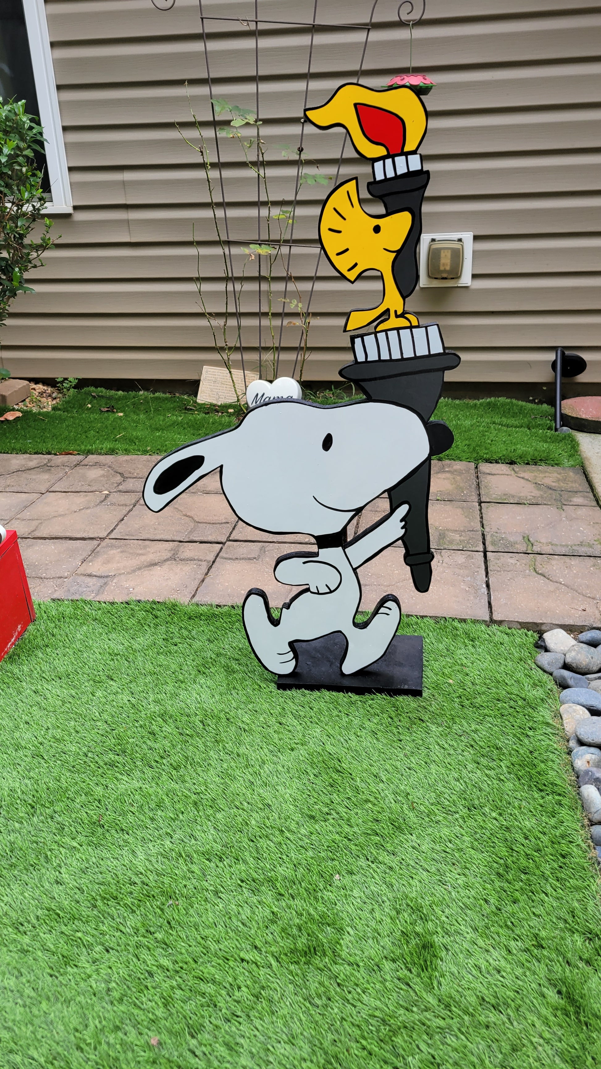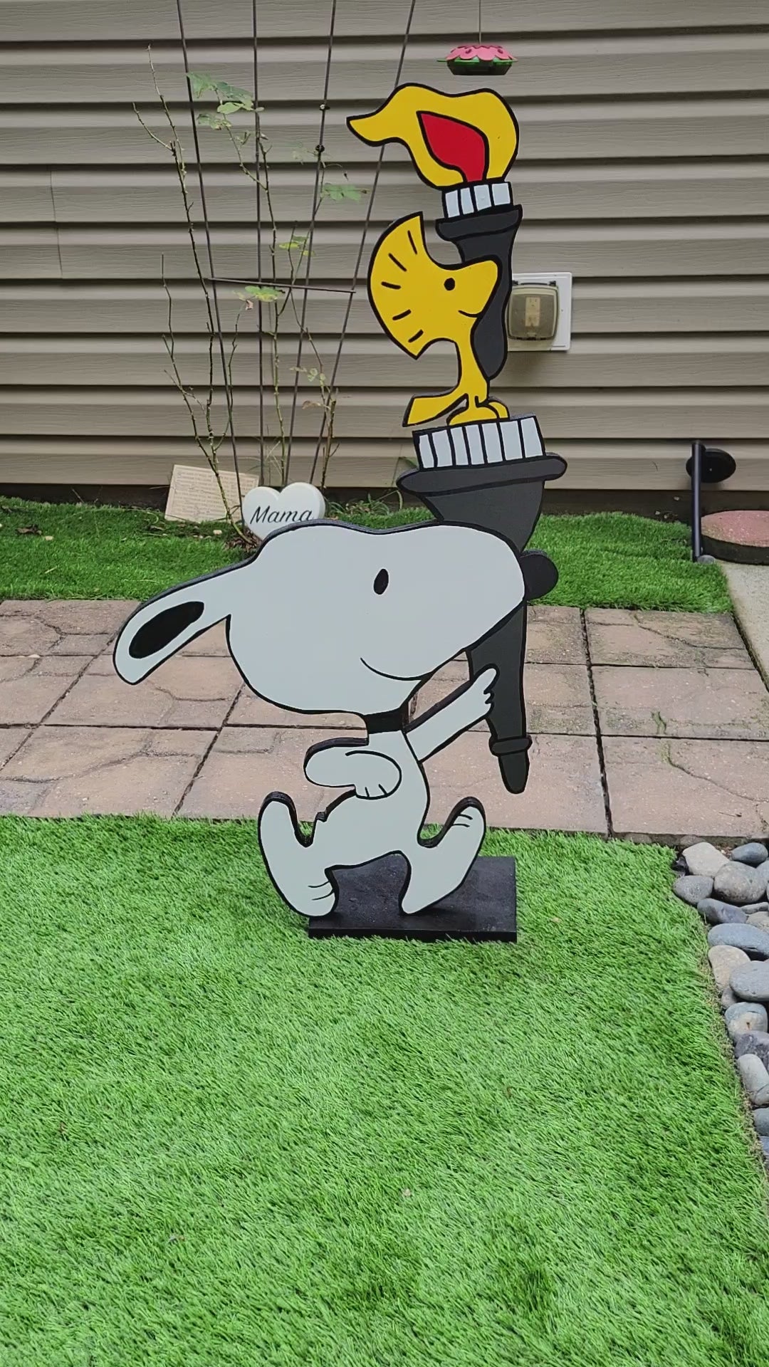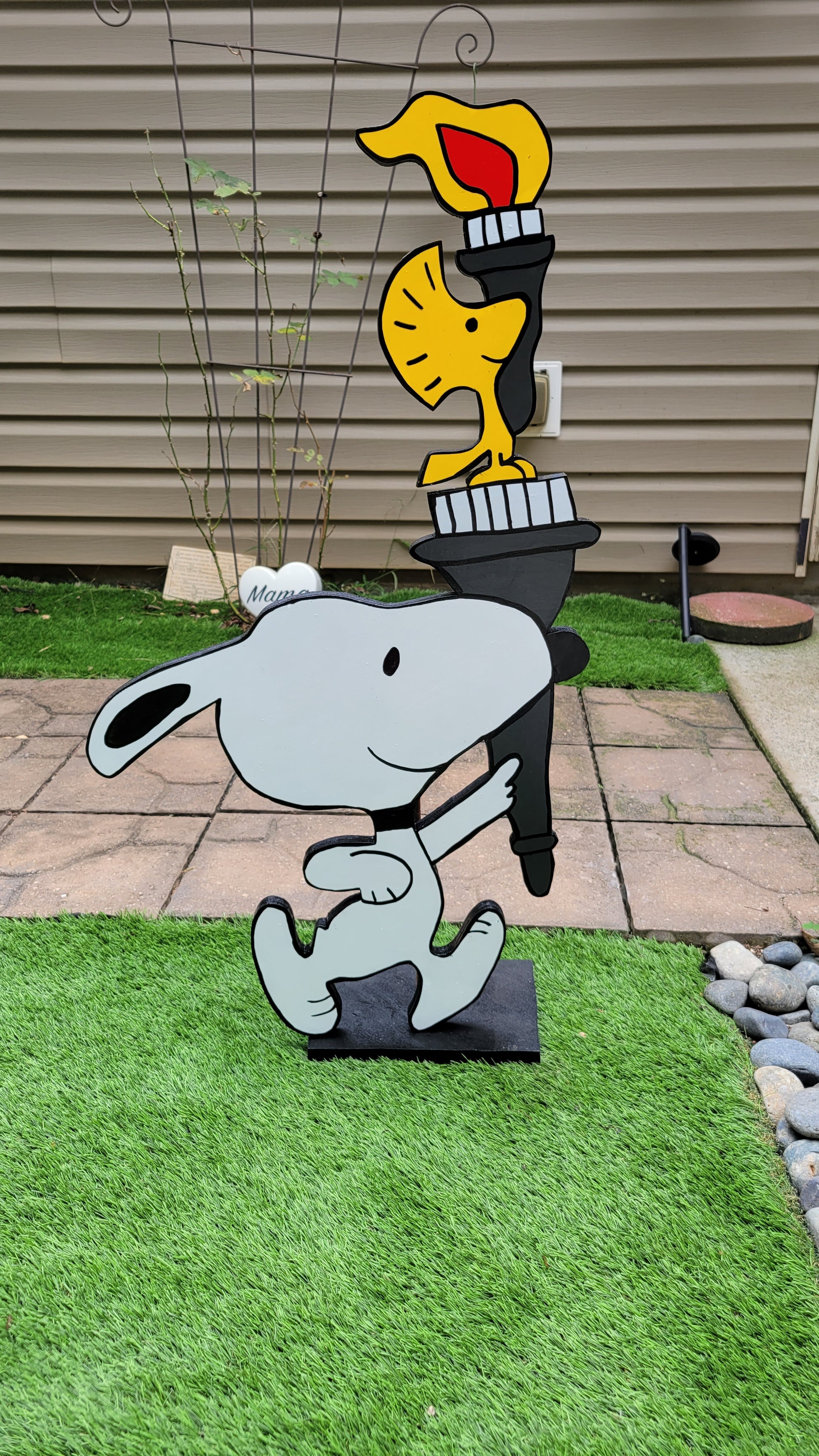 32" tall Snoopy and Woodstock carrying the Olympic torch. Handmade and handpainted by Wood Chic designs. Weather sealed with outdoor poly shield clear coat. All items are made to order and a 2 week process time before shipping by FedEx home delivery.